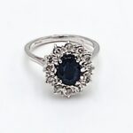 I diamanti, taglio brillante, donano una luce intensa che contrasta perfettamente con la tonalità blu dello zaffiro, creando un effetto prezioso ed equilibrato. La struttura dell’anello presenta un peso di 3,63 grammi, realizzato con titolo 750/1000, robusto ma elegante al dito.
