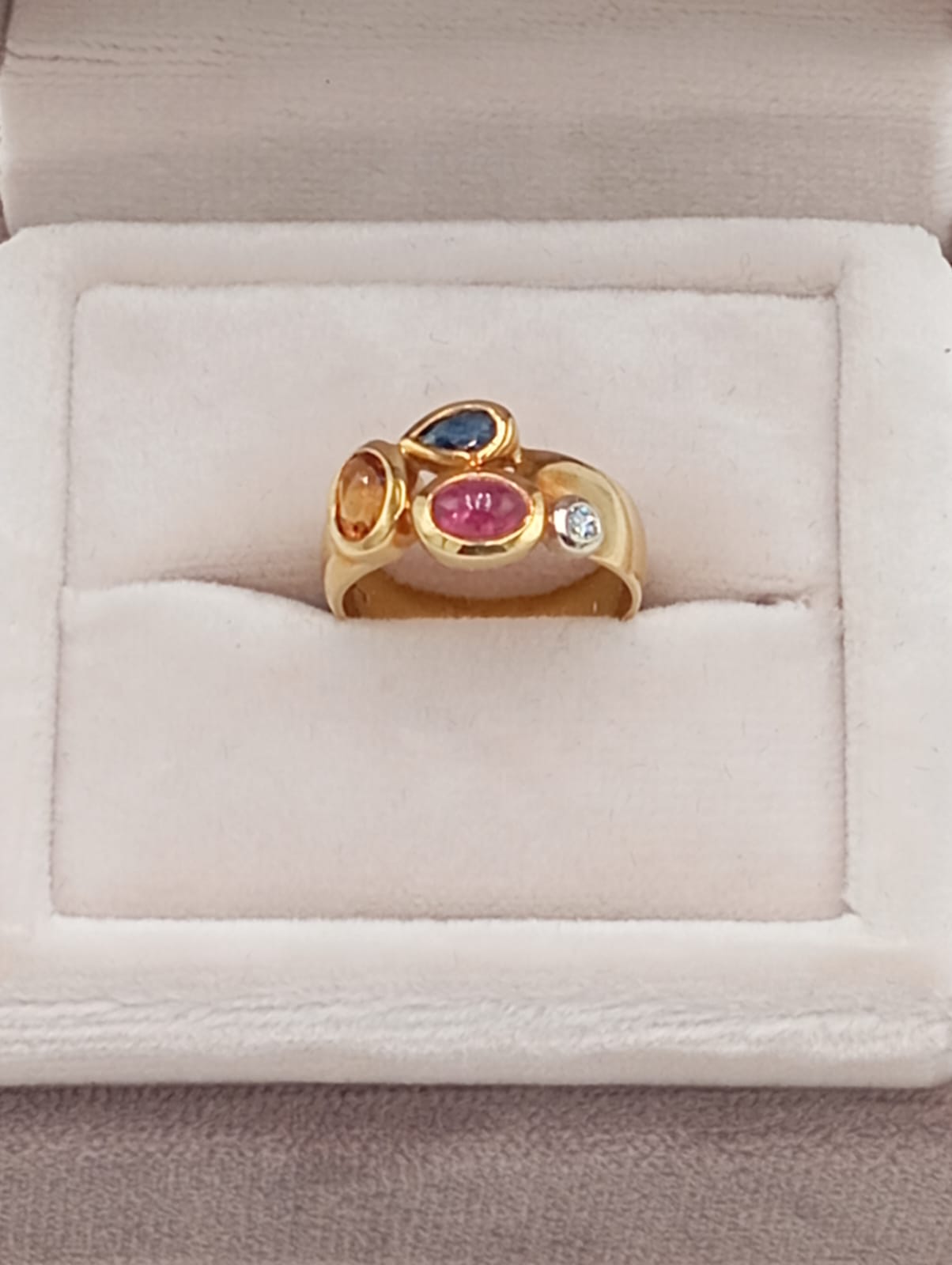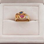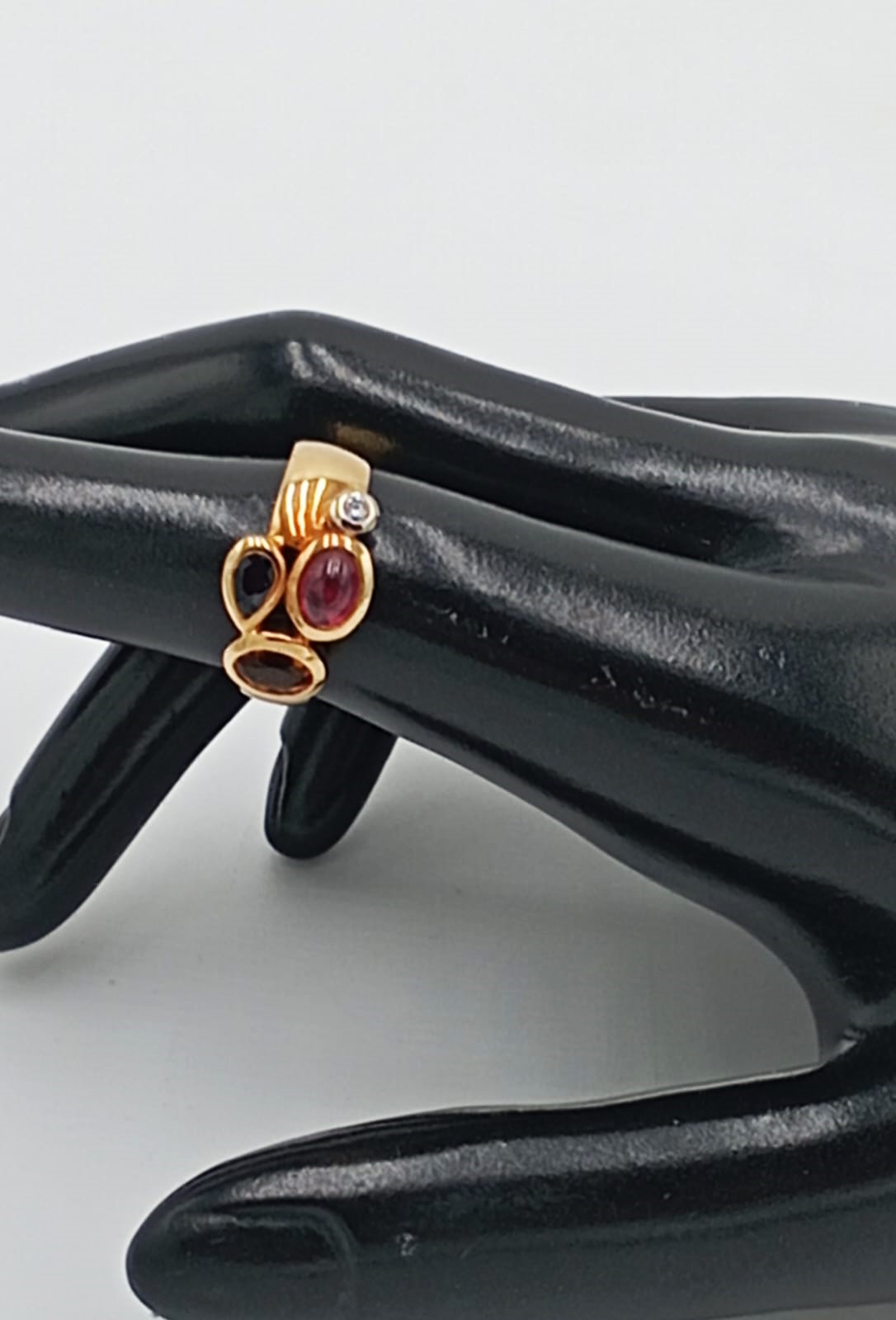 Anello scenografico in oro giallo 18 kt Manfredi dal design artistico e ricercato, caratterizzato da una montatura avvolgente che abbraccia tre pietre colorate di diversa dimensione e tonalità. Le pietre, disposte in modo armonico, creano un contrasto cromatico vivace e raffinato: una pietra rossa centrale dal taglio ovale che richiama i toni del rubino, una pietra color ambra calda e luminosa, e una pietra verde più piccola che dona equilibrio e un tocco naturale alla composizione.