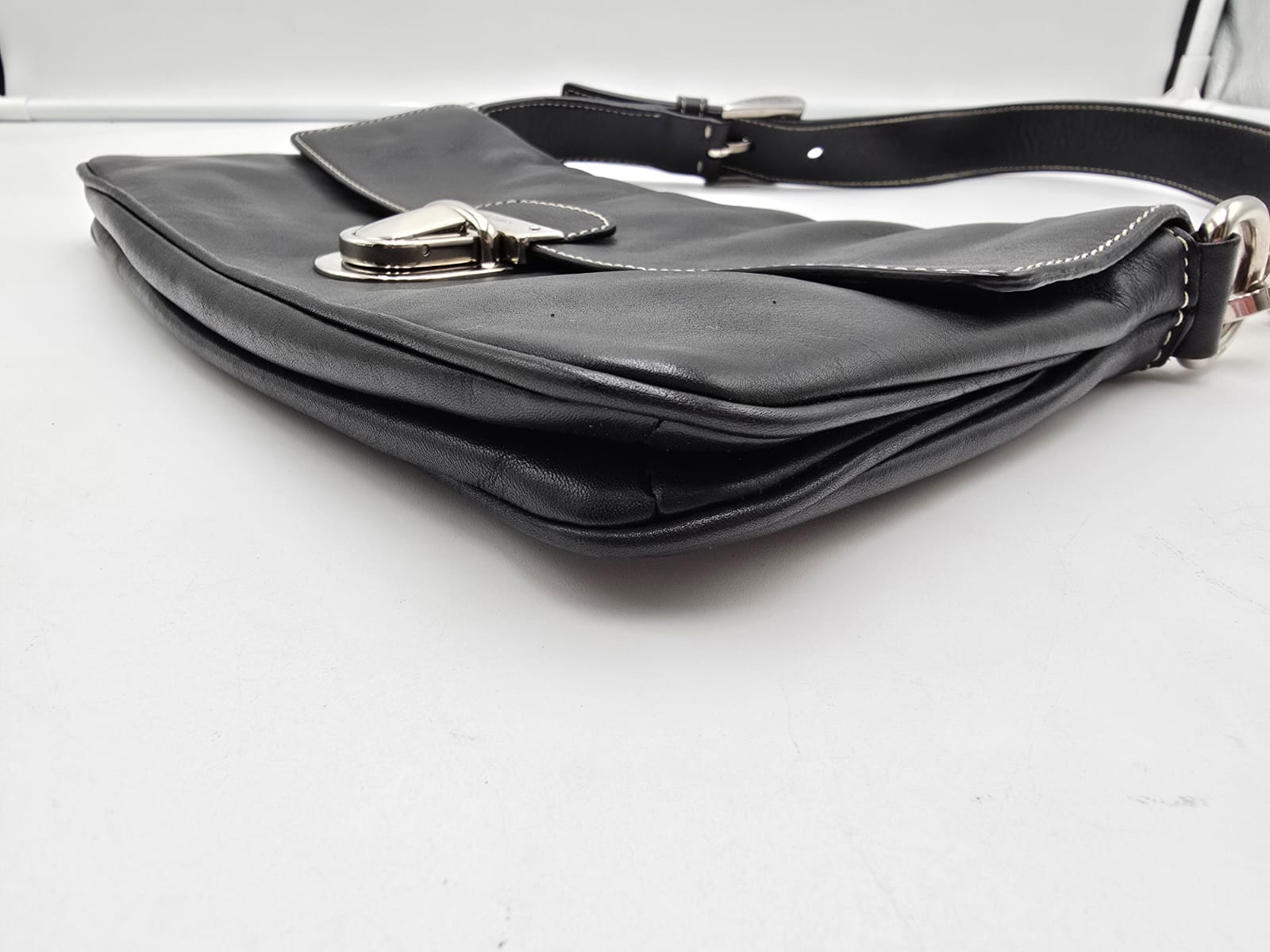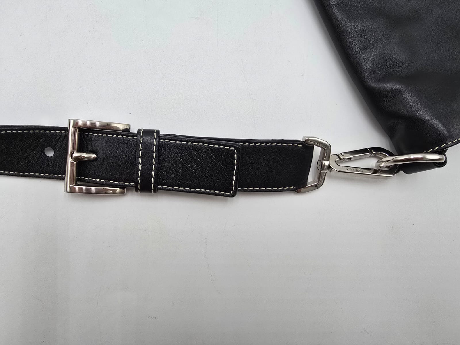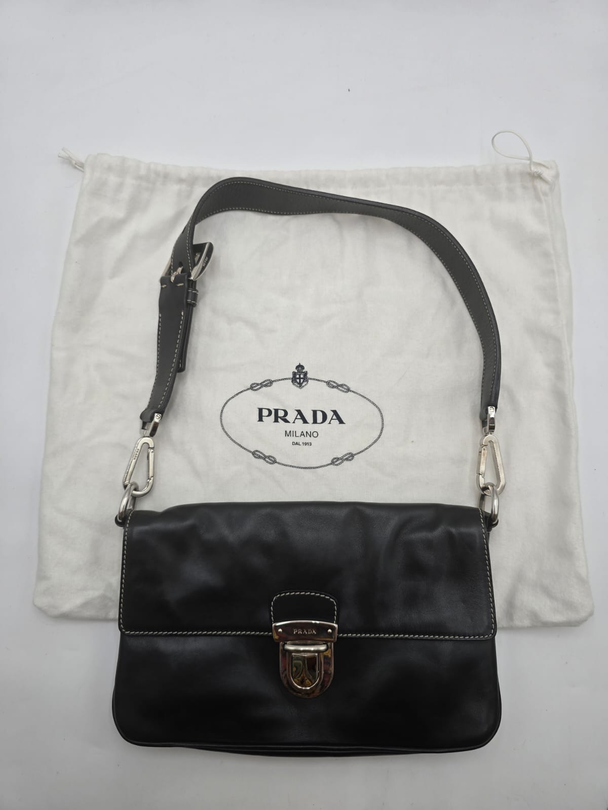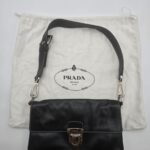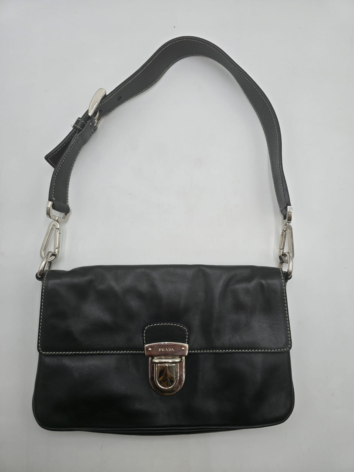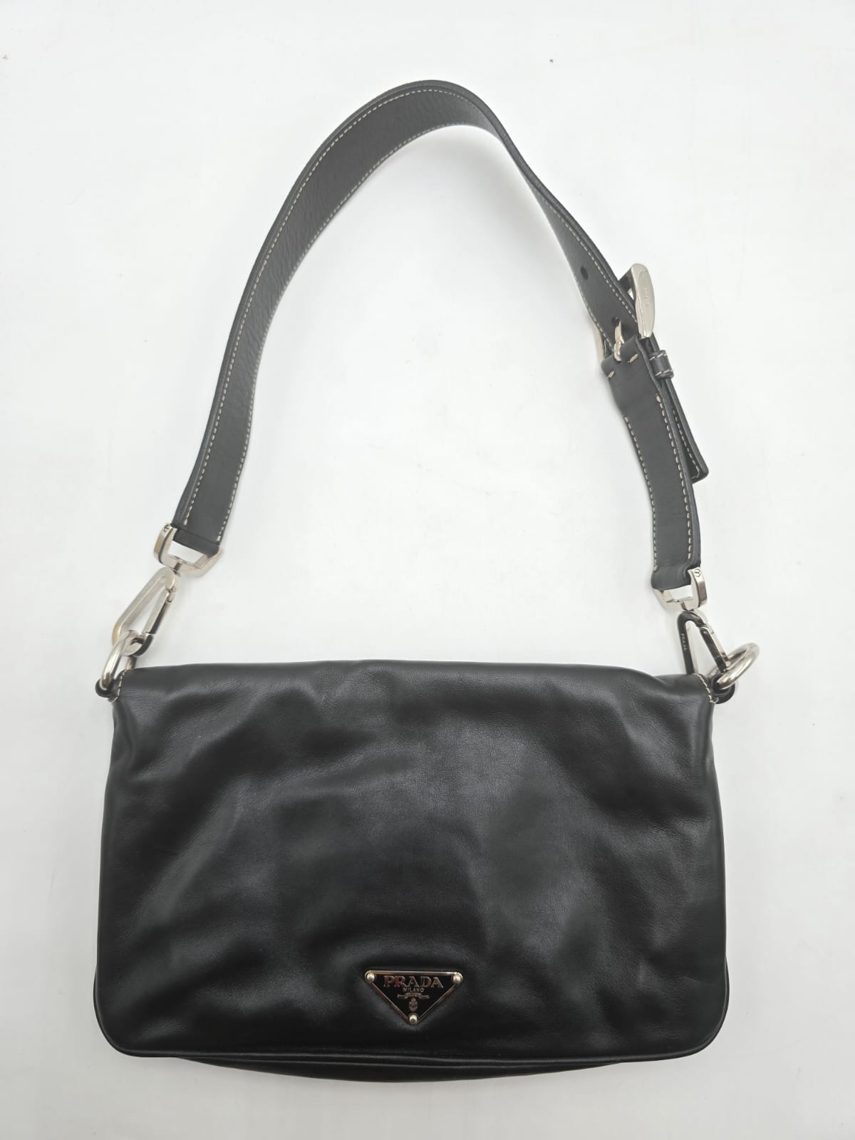 Borsa a spalla Prada baguette flap in morbida pelle di vitello color nero con cuciture a vista dettagli in argentato e la chiusura a pressione sulla patta frontale. La borsa ha una tracolla in pelle regolabile e rimovibile, quindi la borsa potrebbe essere usata anche come una pochette.