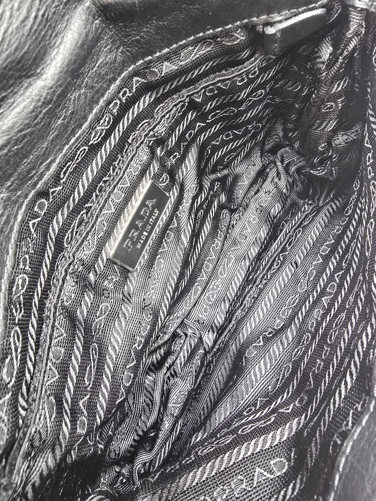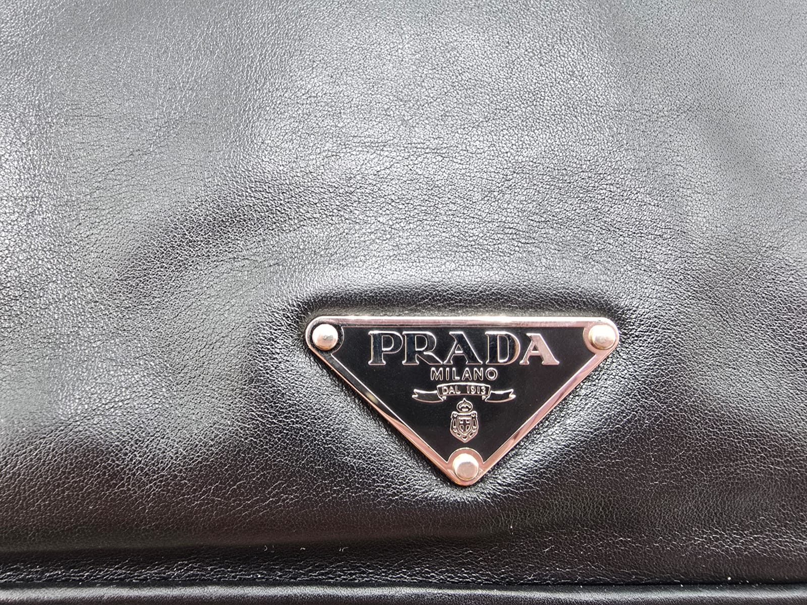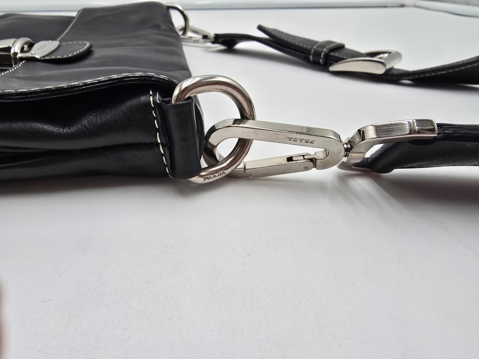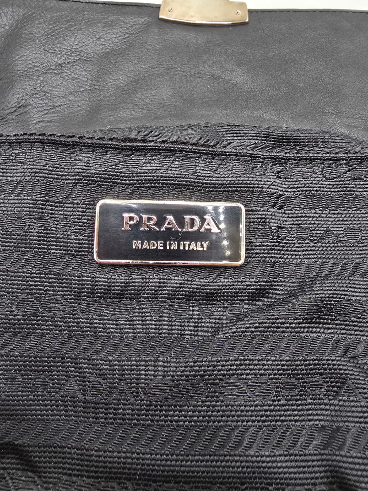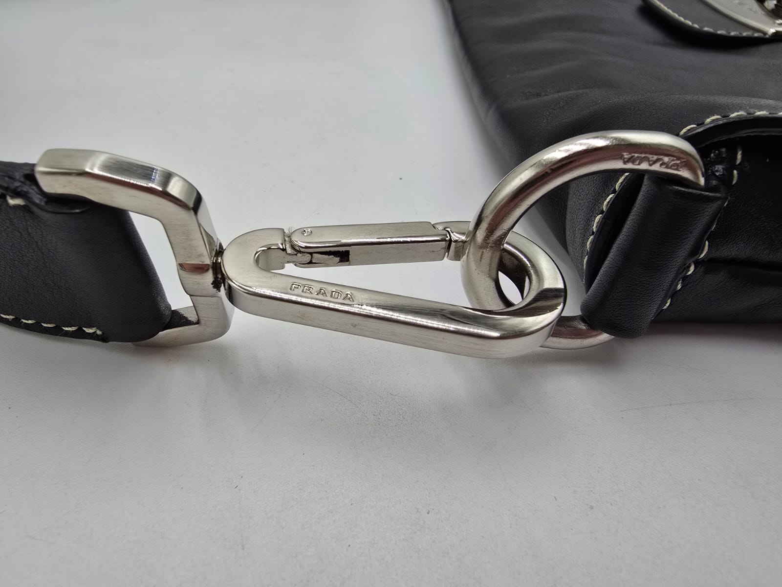 Borsa a spalla Prada baguette flap in morbida pelle di vitello color nero con cuciture a vista dettagli in argentato e la chiusura a pressione sulla patta frontale. La borsa ha una tracolla in pelle regolabile e rimovibile, quindi la borsa potrebbe essere usata anche come una pochette.