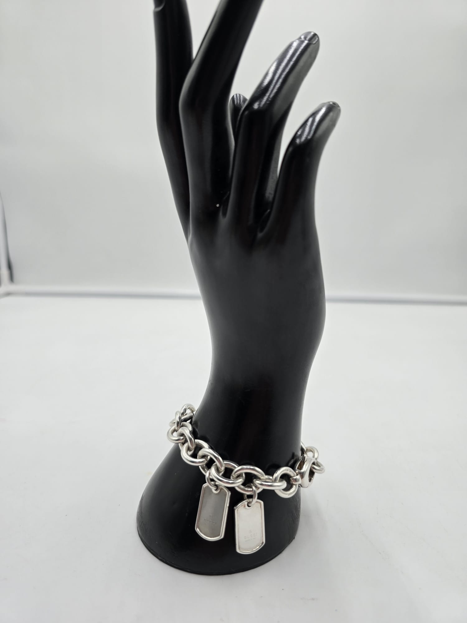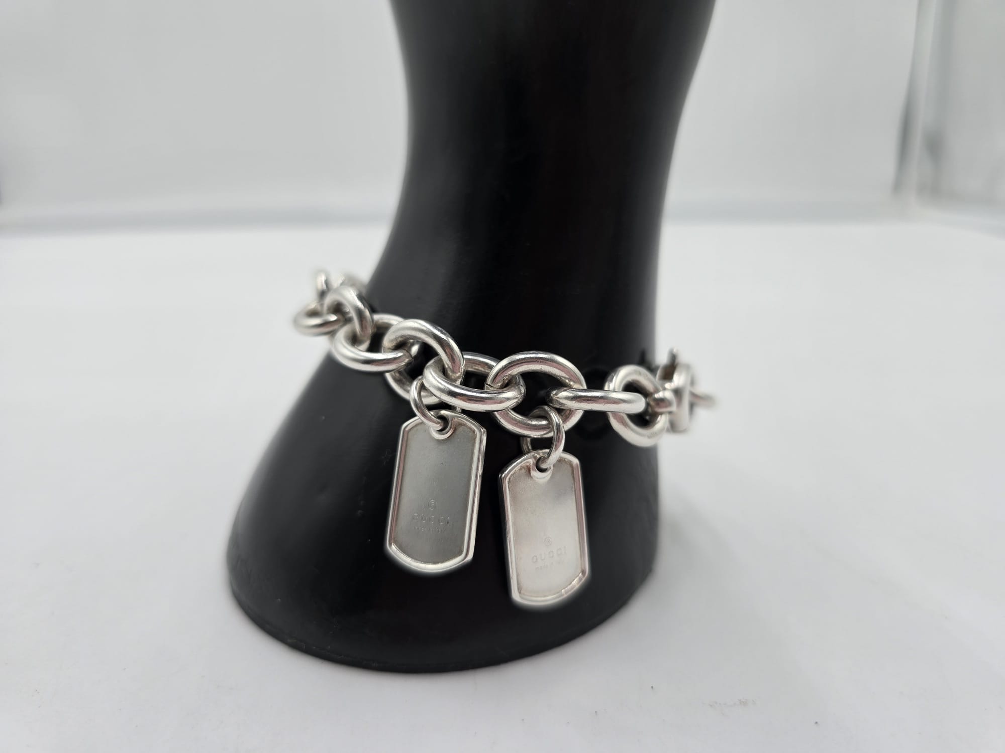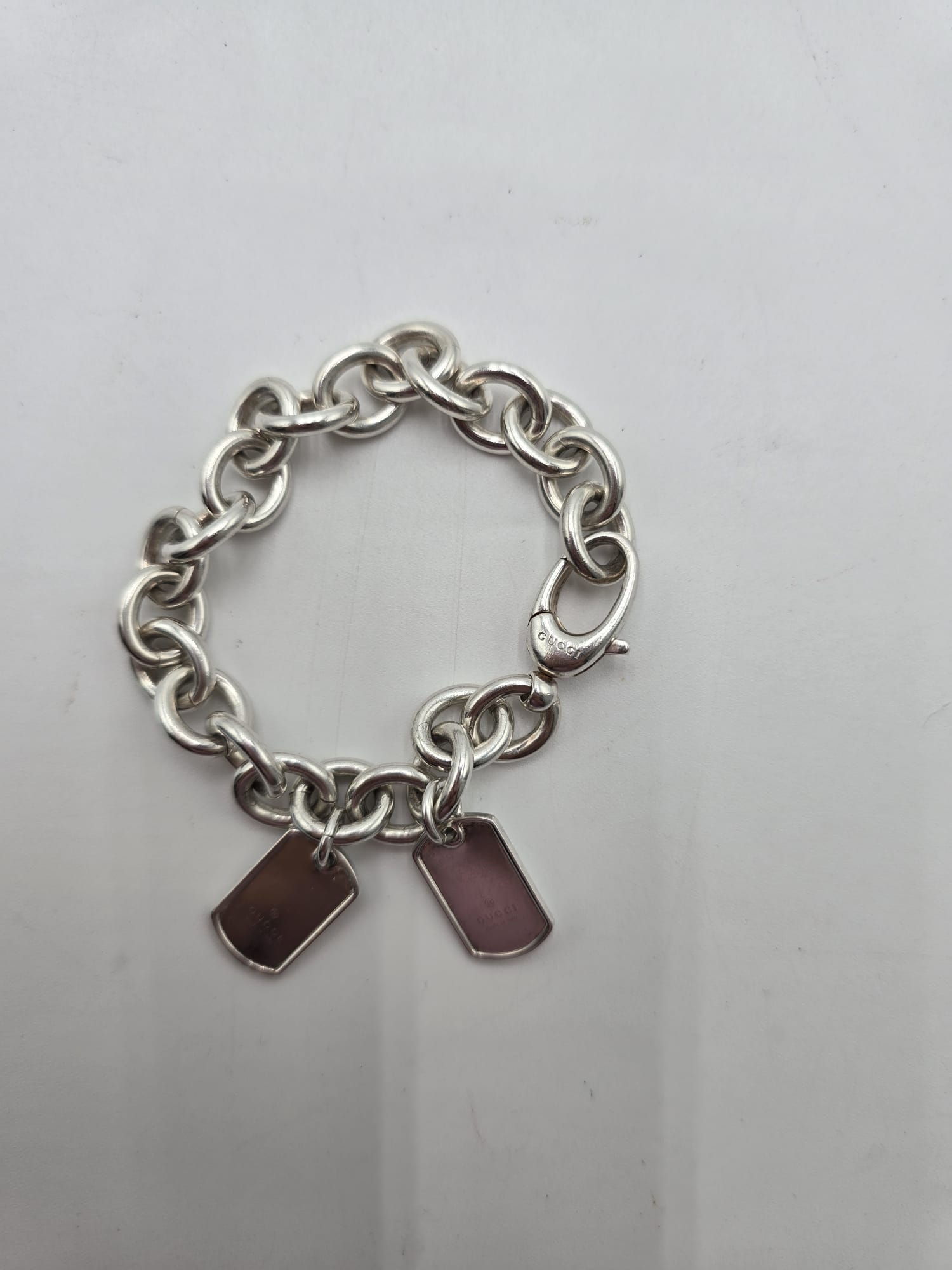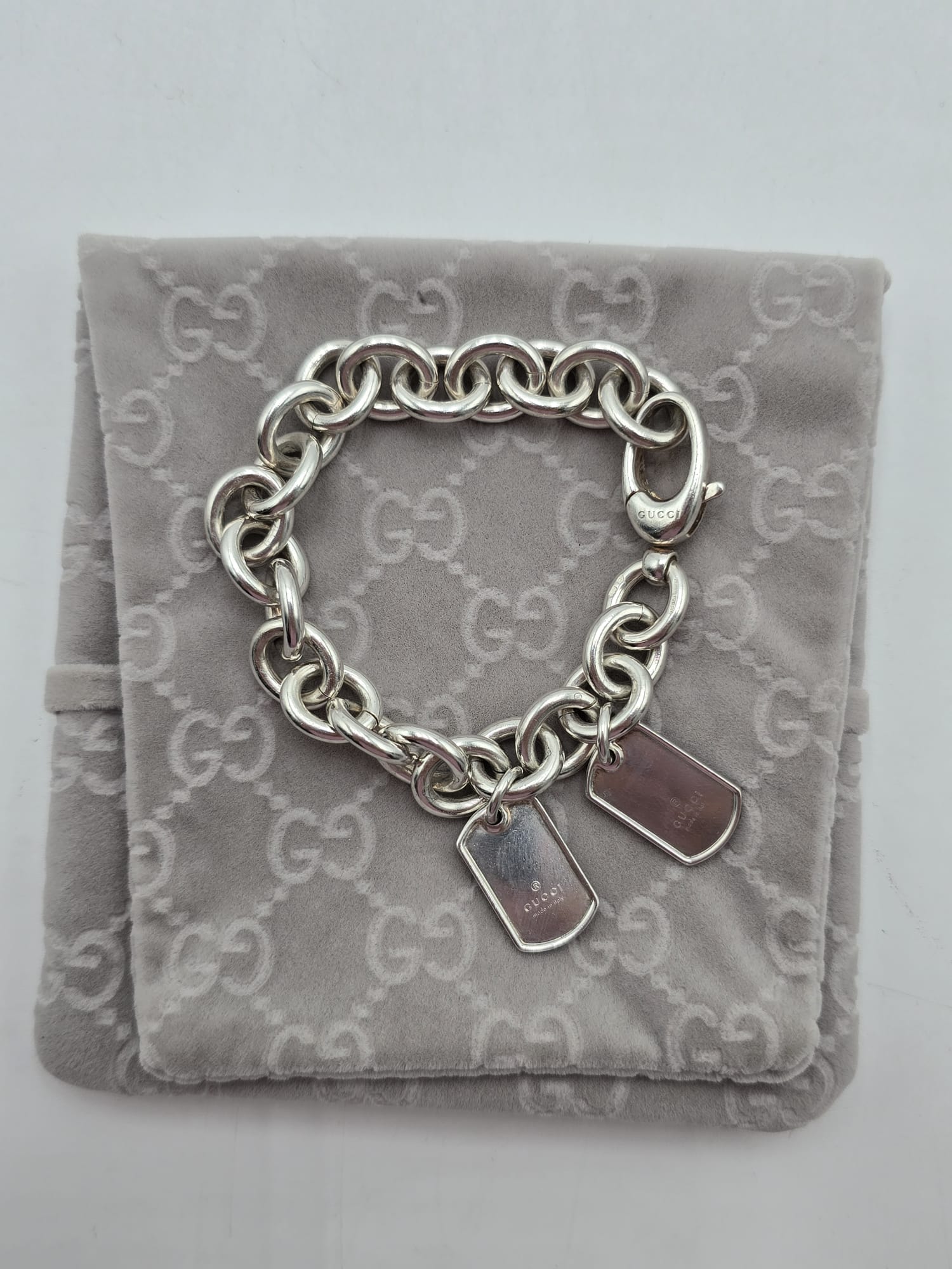 Un bracciale senza tempo.. Bracciale Gucci double dog-tag in argento, presenta le maglie grandi e ovali con due ciondoli a targhetta.