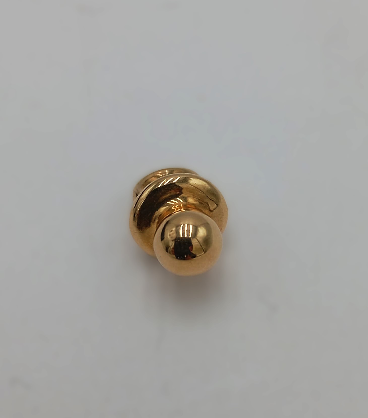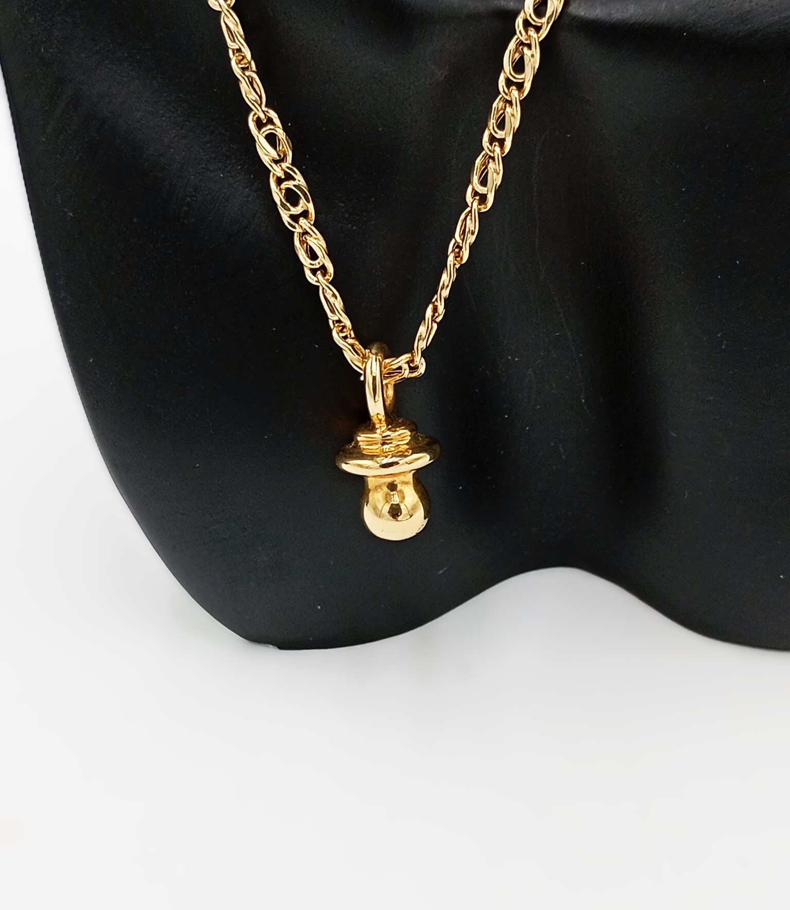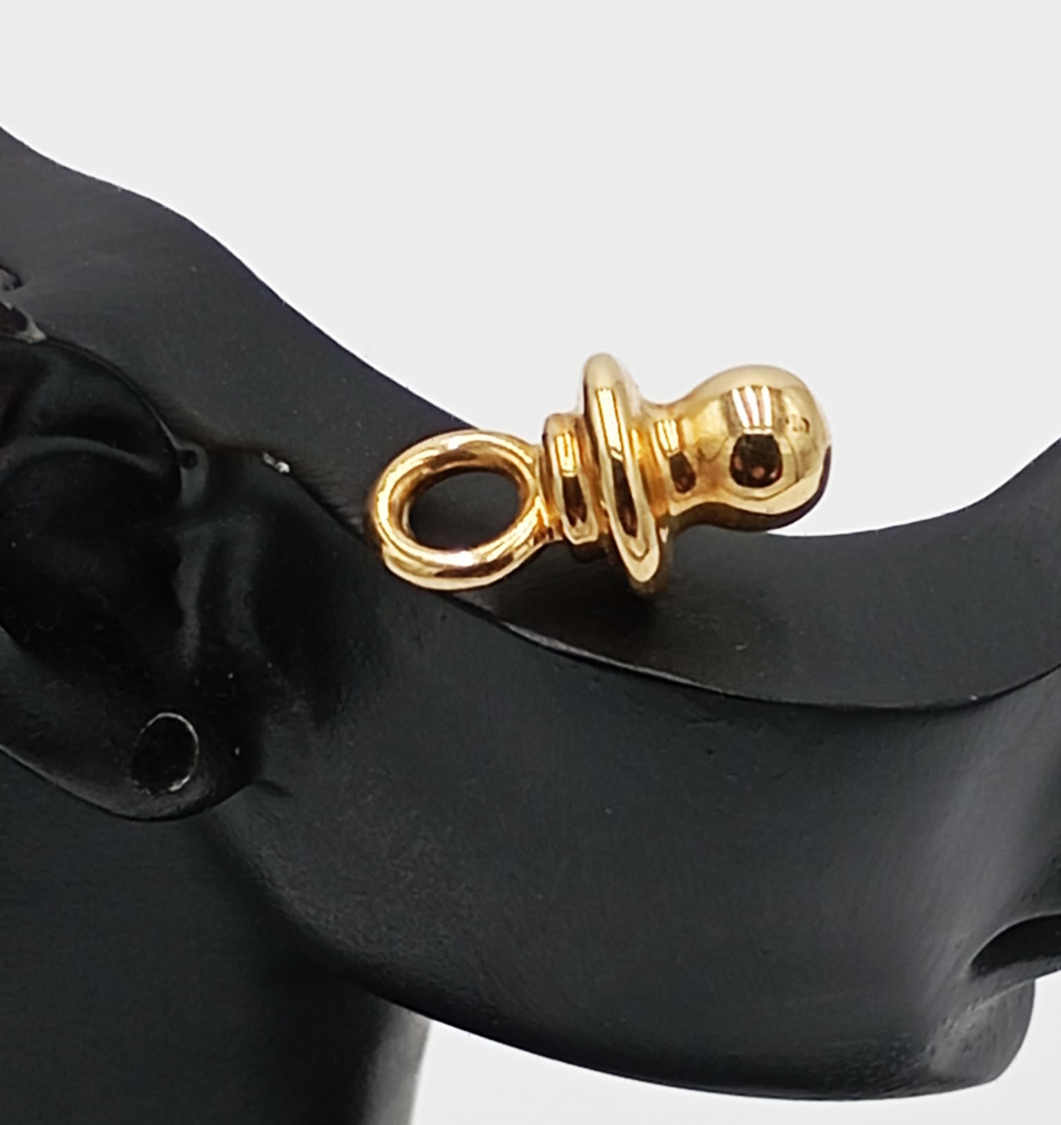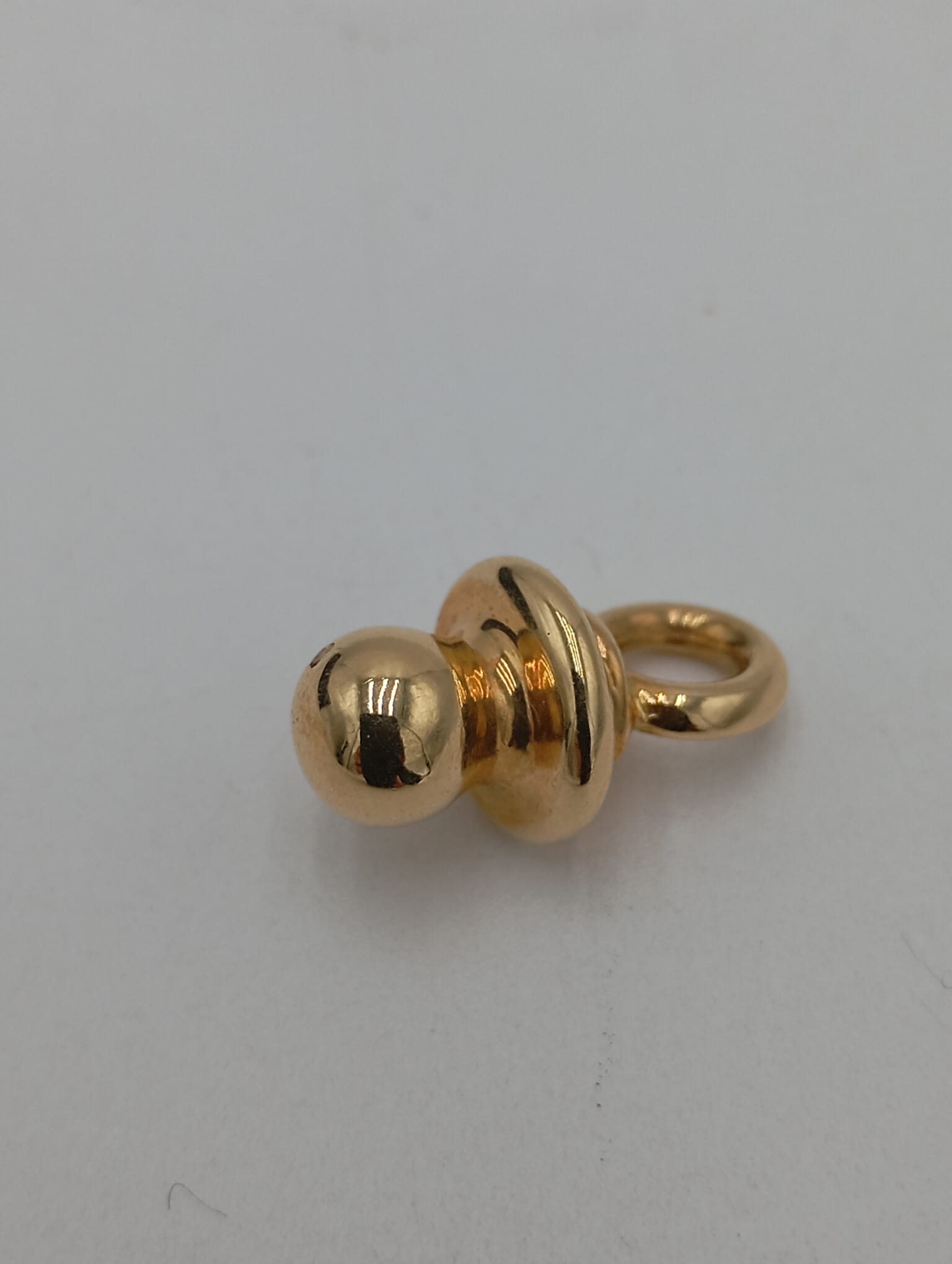 Ciondolo in oro giallo 18kt a forma di ciuccio, peso 2,3 grammi, delicato ed elegante, perfetto come gioiello simbolico.