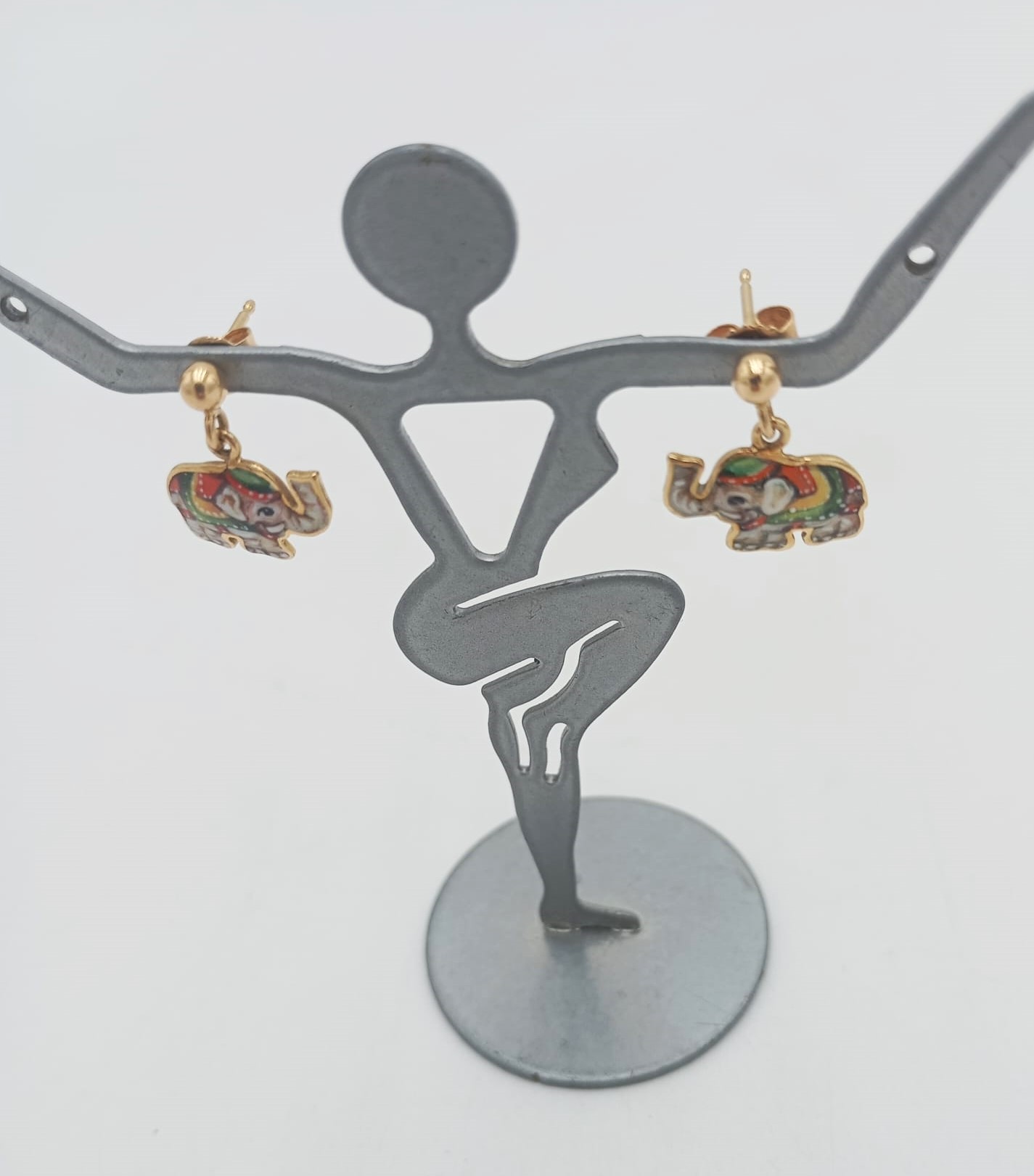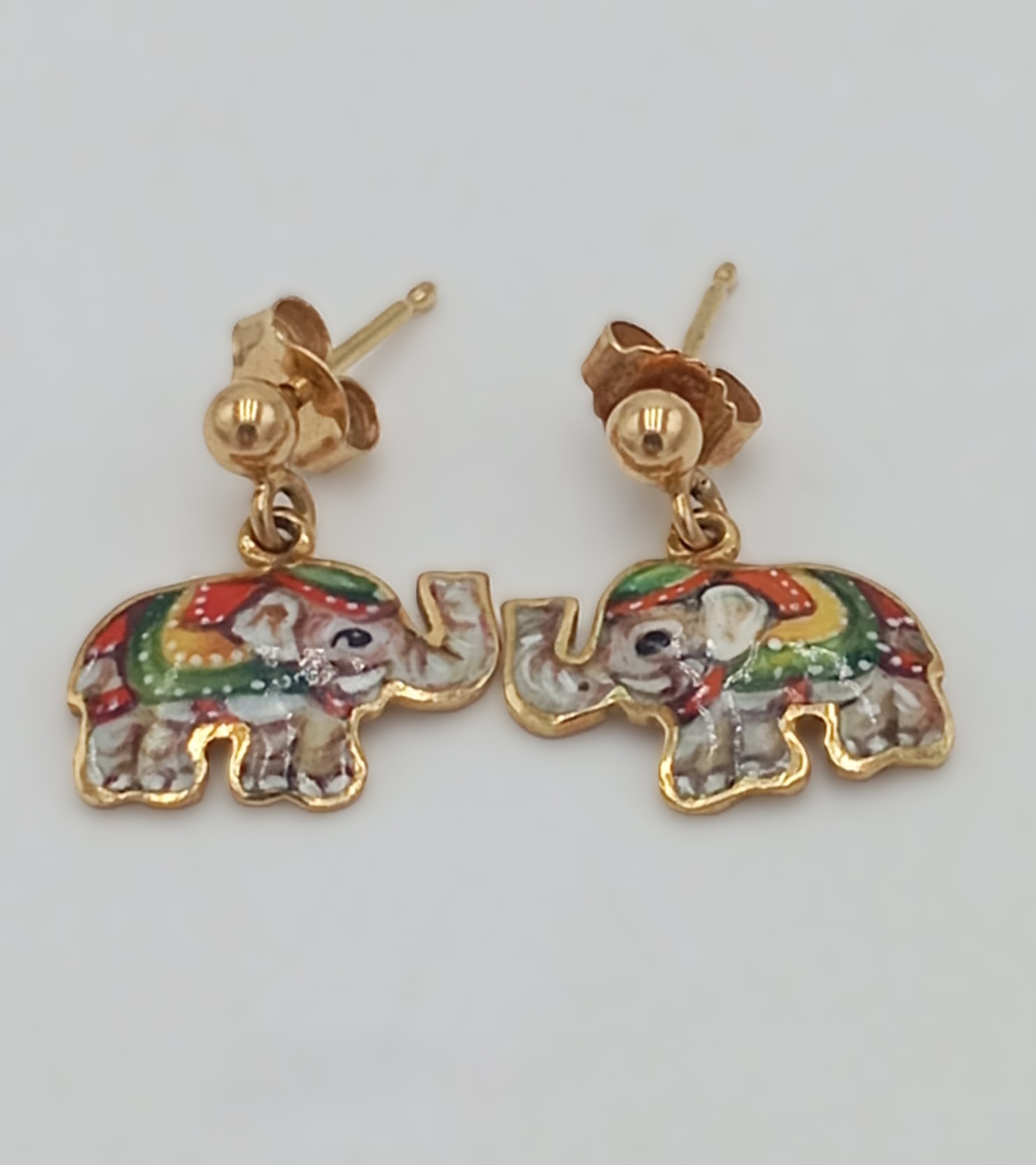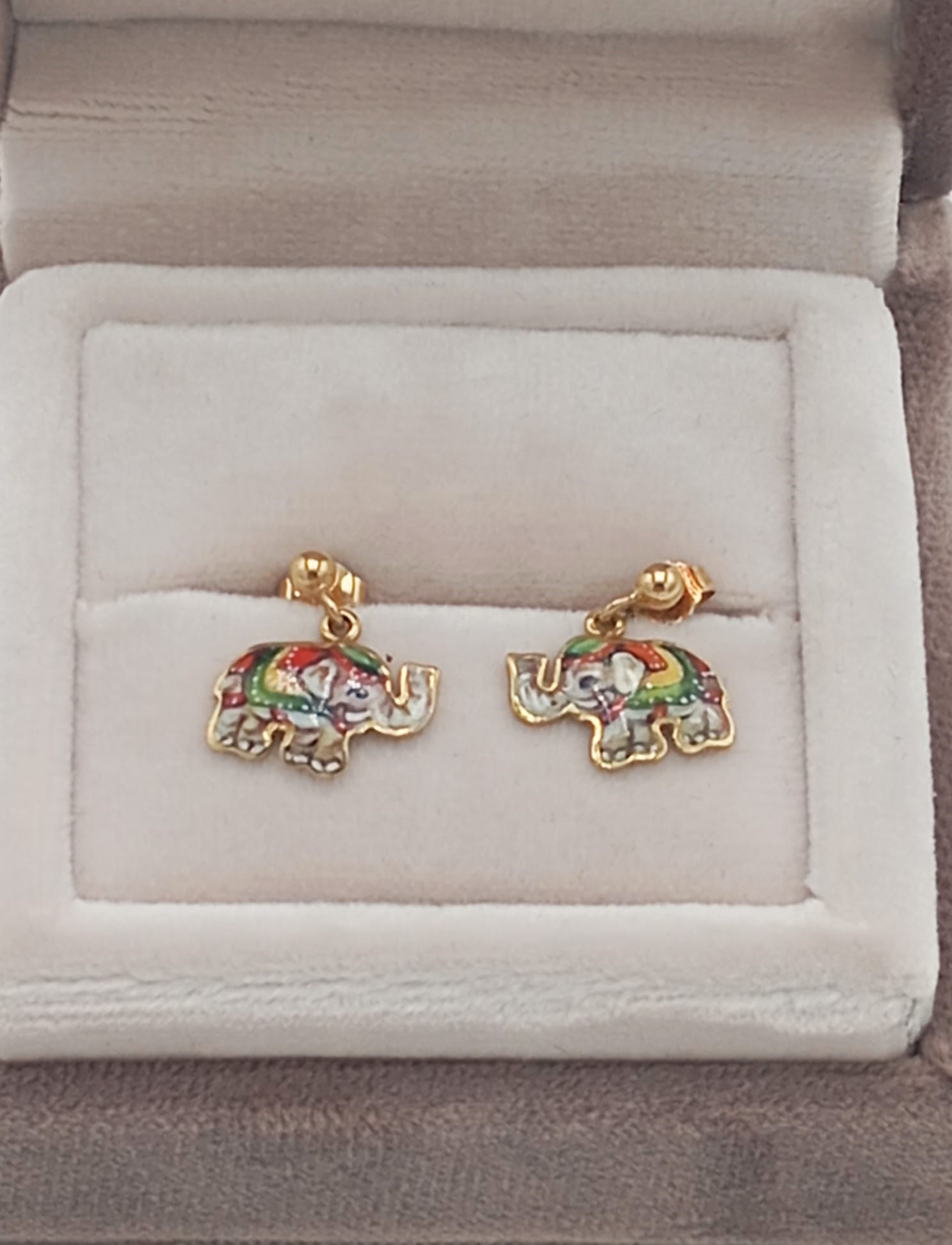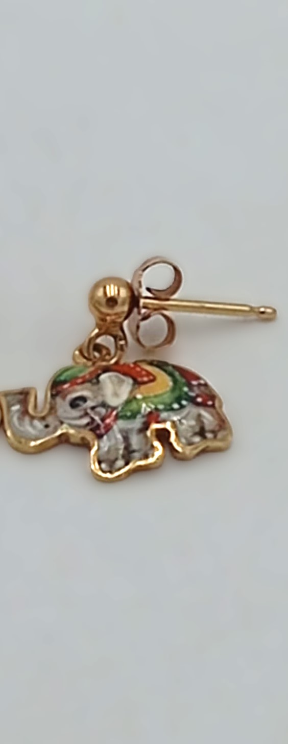 Simpatici e raffinati, questi orecchini a forma di elefante uniscono la vivacità dello smalto colorato alla luminosità dell’oro giallo 18kt, creando un gioiello unico e ricco di personalità. Le decorazioni smaltate mettono in risalto i dettagli della figura, rendendoli perfetti sia per un look quotidiano che per aggiungere un tocco di originalità alle occasioni speciali.