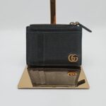 Questo portafoglio compatto Gucci Ophidia GG combina eleganza e praticità in un design raffinato. Realizzato in pelle nera martellata, presenta sulla parte frontale il logo Double G in metallo dorato, simbolo iconico della Maison.