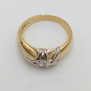 Anello in oro giallo e bianco 18 kt da 6,12 g, con diamante naturale da circa 0,15 ct colore G. Design elegante e misura 17.