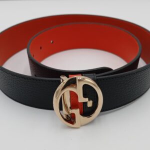 Gucci, cintura nera con interno rosso e fibbia GG dorata: lusso classico, carattere moderno.