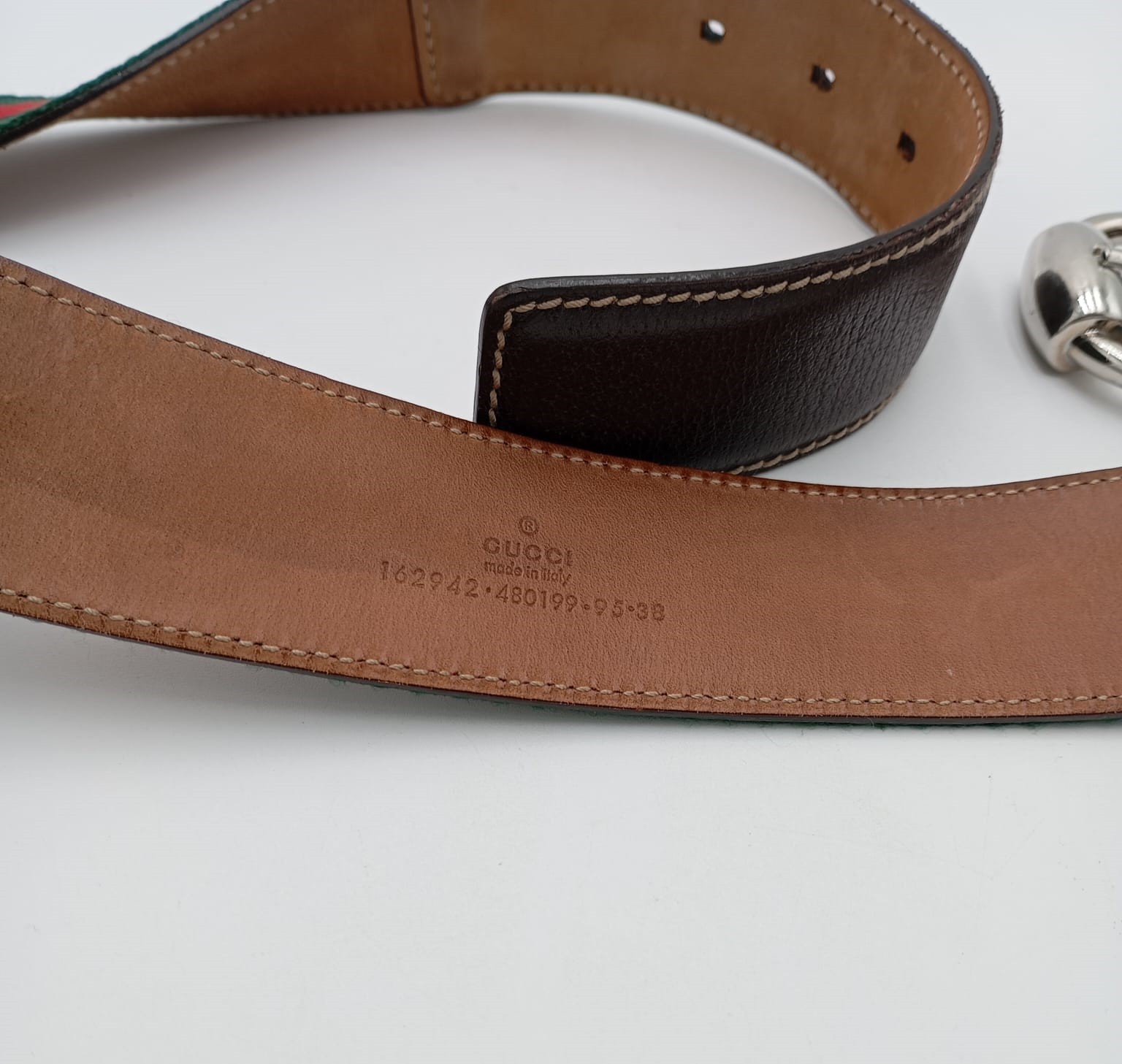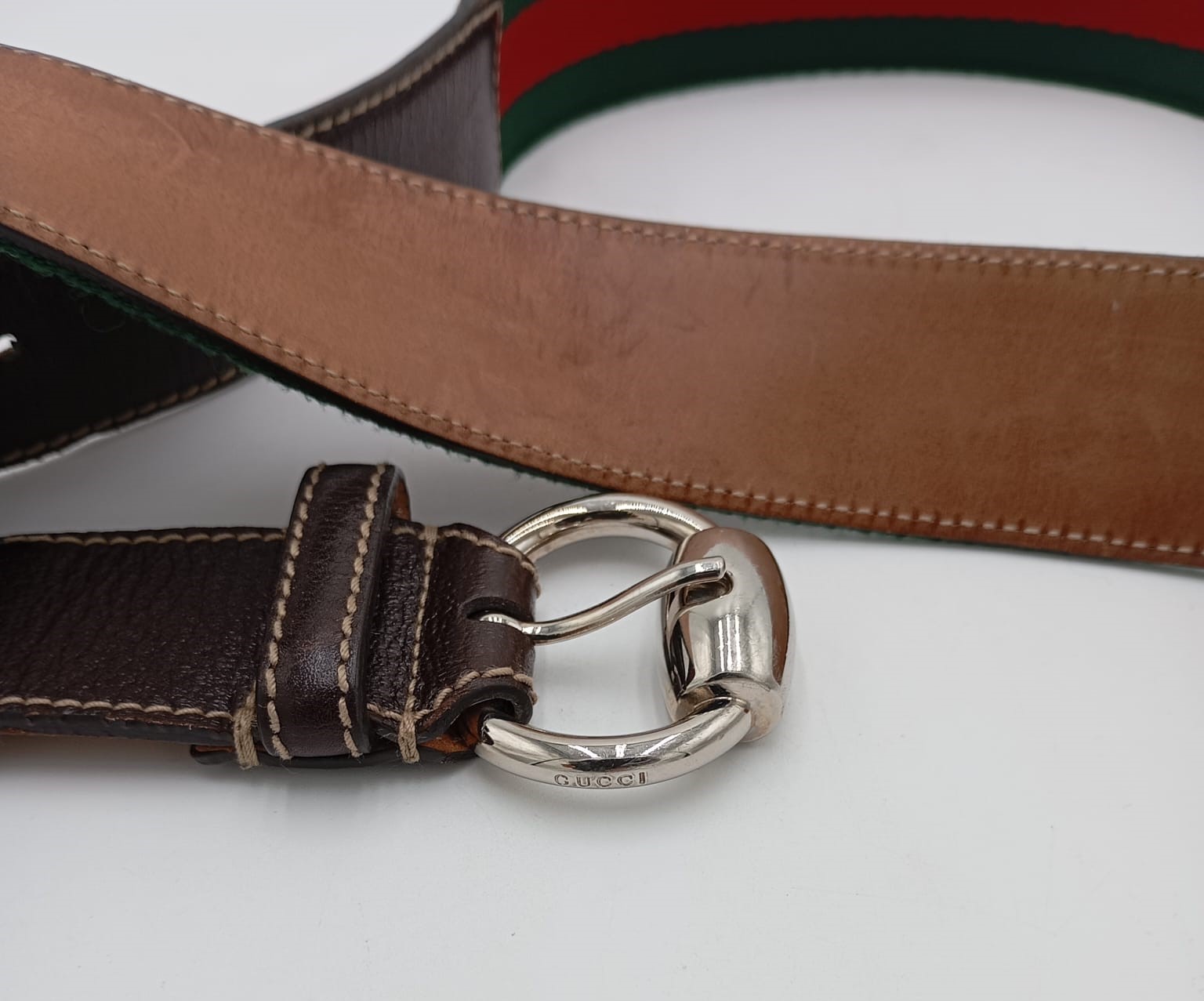 Cintura Gucci Web in tessuto verde e rosso con dettagli in pelle marrone e fibbia argentata a doppio anello.